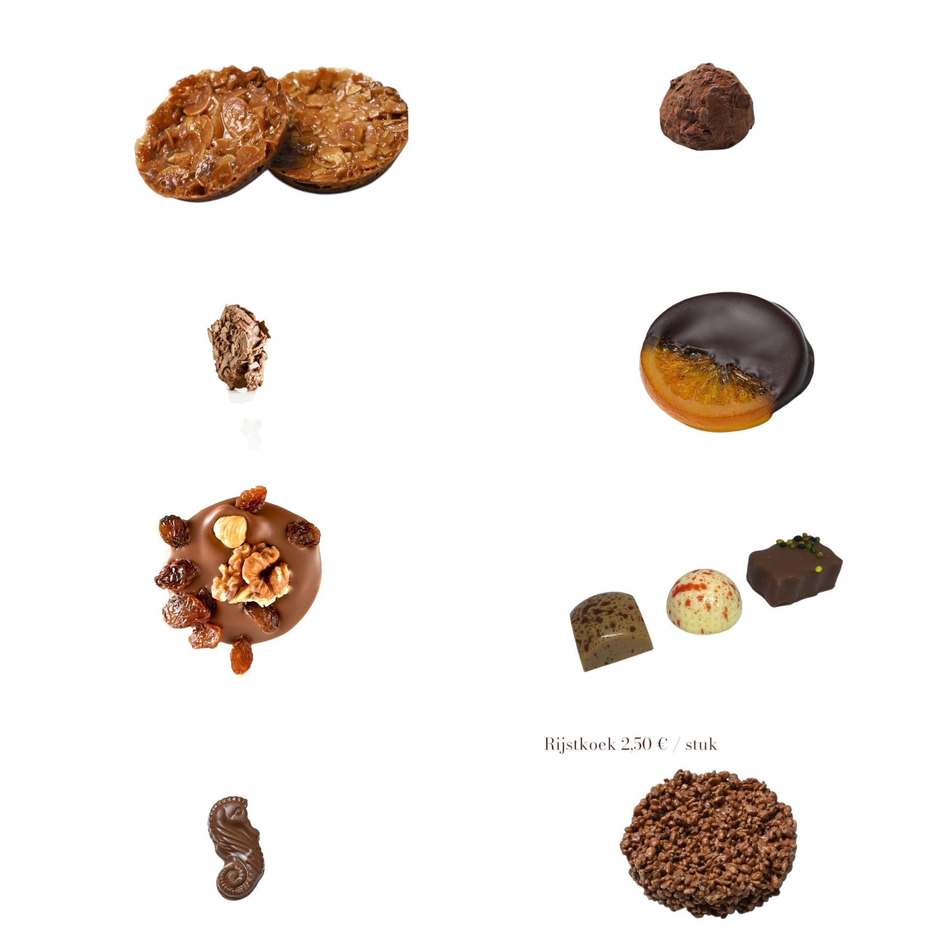 Florentines, cacaotruffels, botertruffels, orangeschijven , studentenhaver , pralines, zeevruchten 64 €/ kg